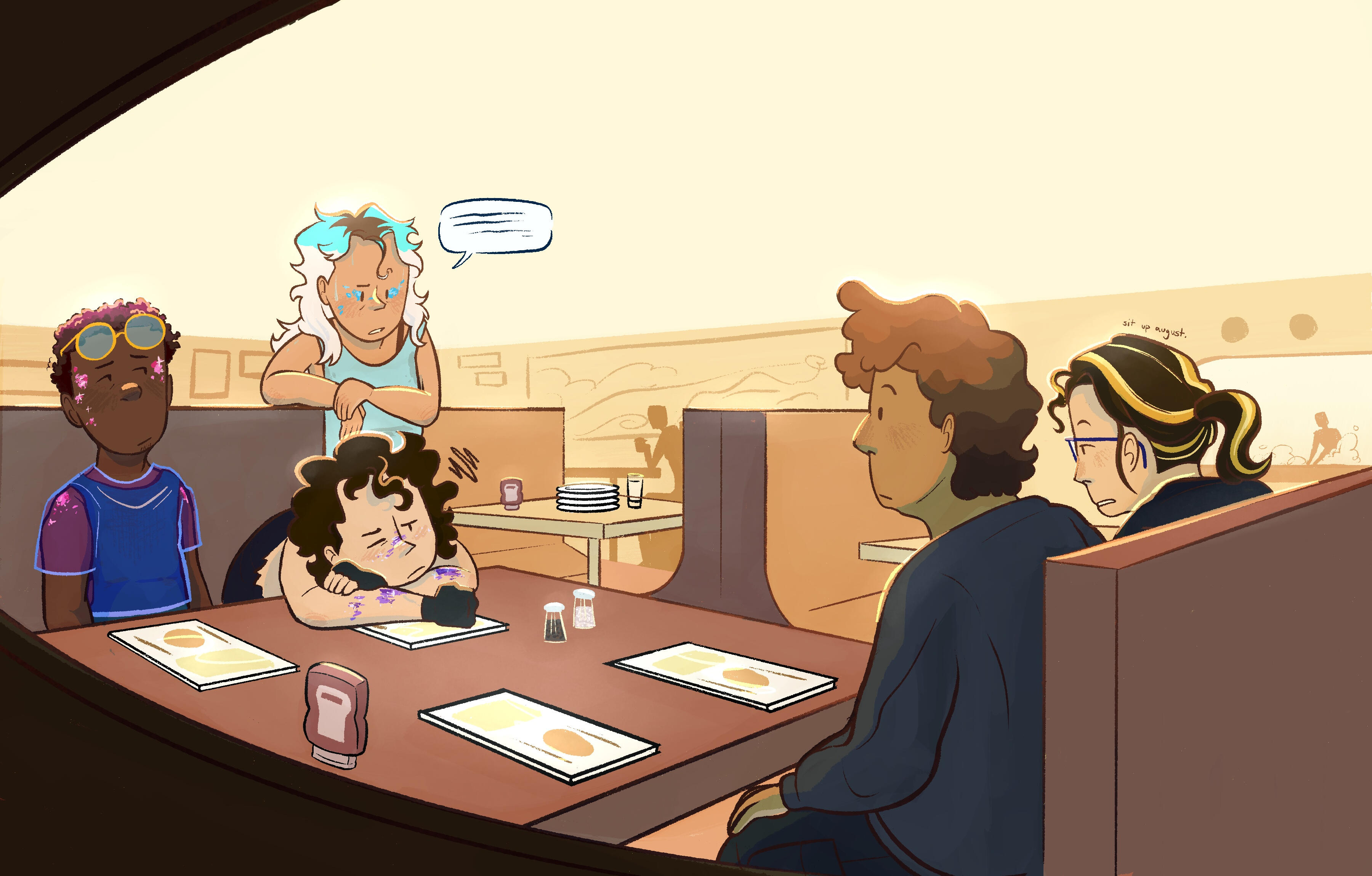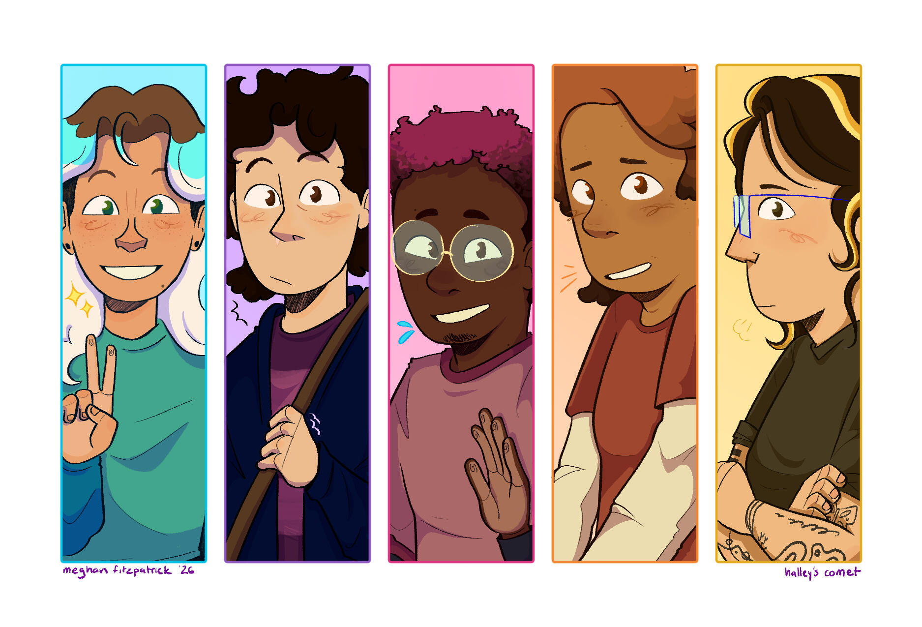 Halley's Comet is my junior thesis project focusing on a made-up band full of 20-somethings who are currently trying to get their act off the ground--aiming for the stars to land among them, that kinda thing. The thesis, technically, focuses on exploration when it comes to merchandising for live music acts and in the music industry in general (band posters, album covers, physical merchandise, etc.) ..with a mock up graphic novel cover thrown in, maybe.This section will have reference sheets of each member (the main act and the crew,) sketches, thumbnails, everything in between until the final product :-)