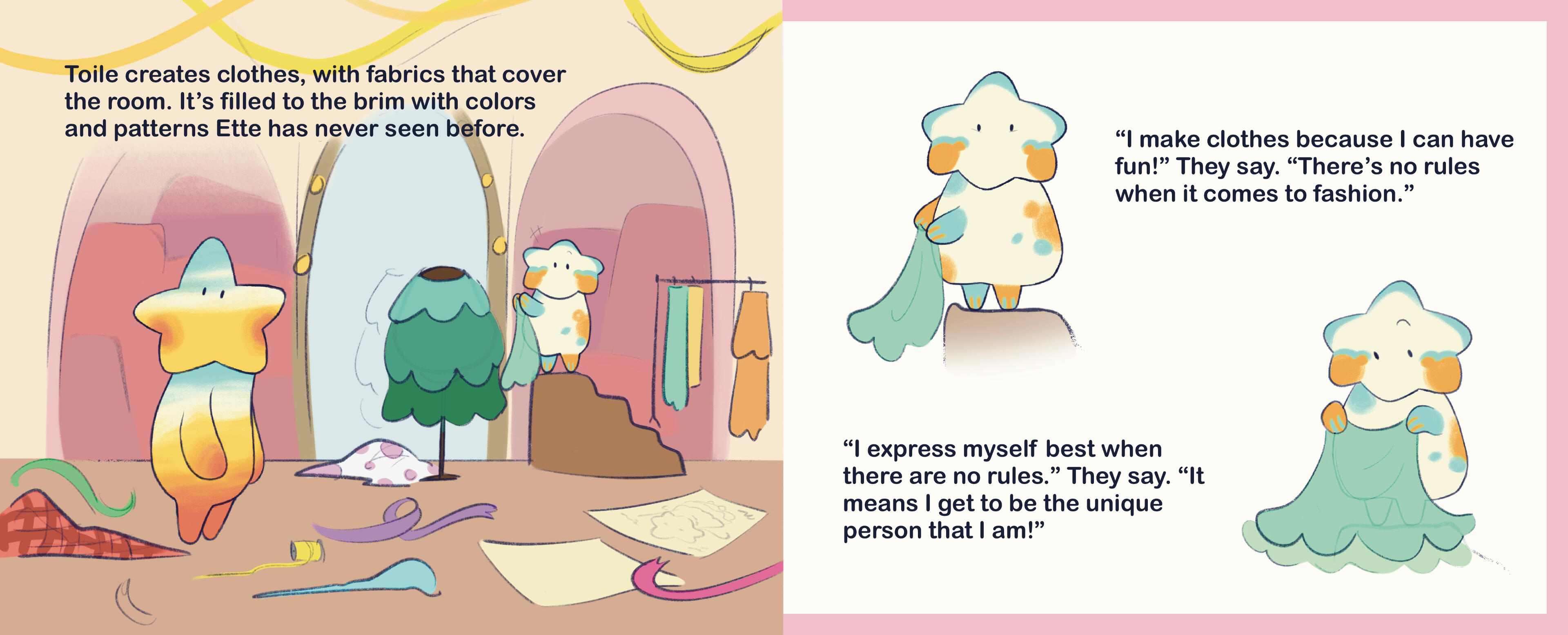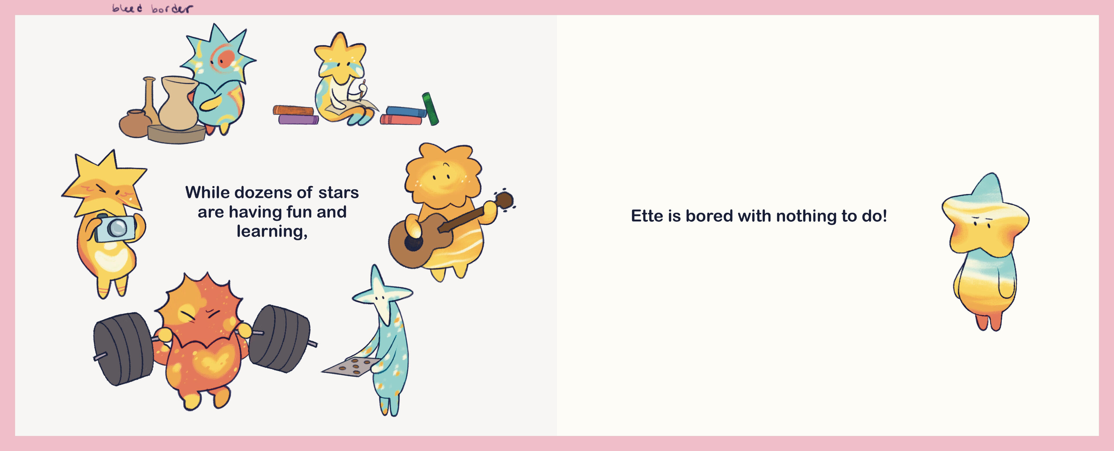 In lieu of applying for a traditional internship to satisfy graduation requirements for the summer of my senior year at Moore, I instead created a proposal and applied for an Unique Experiental Learning Opportunity, or a UELO for short. It still requires the same amount of hours to be fufilled, but I have a bit more creative control throughout the entire process, with guidance of a mentor. Enter me, deciding to create a children's picture book, featuring Ette.This is a book intends to tell a story of how one finds their passion for a specific area of their life, with the help and guidance of some friends and family along the way. Inspired by me finding my own love for art since I was little. :-)